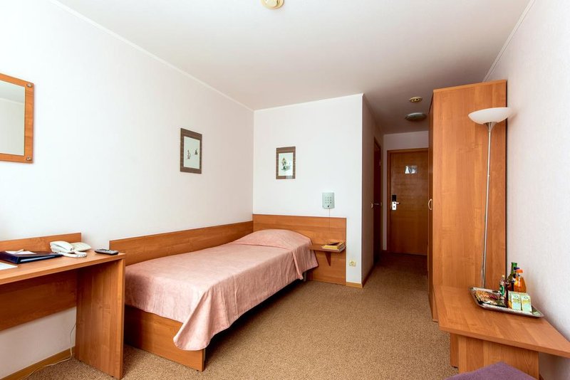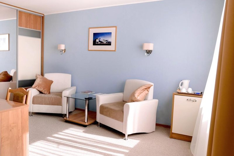 Apri Polet Hotel is conveniently located 700 meters from the airport building. At the same time, each room and restaurant of the Apri Polet hotel has enhanced soundproofing, so nothing will disturb the quiet rest of guests. The hotel has "Standard" single and double rooms, as well as Suites. Each room has a bed with hypoallergenic cotton bed linen, a workstation with a direct telephone line and wireless Internet connection, a minibar, a kettle, a TV, and air conditioning. The bathroom has a set of toiletries, a hairdryer, and a water heater. The Suite also has upholstered furniture, a bathrobe and slippers. All hotel rooms are non-smoking.